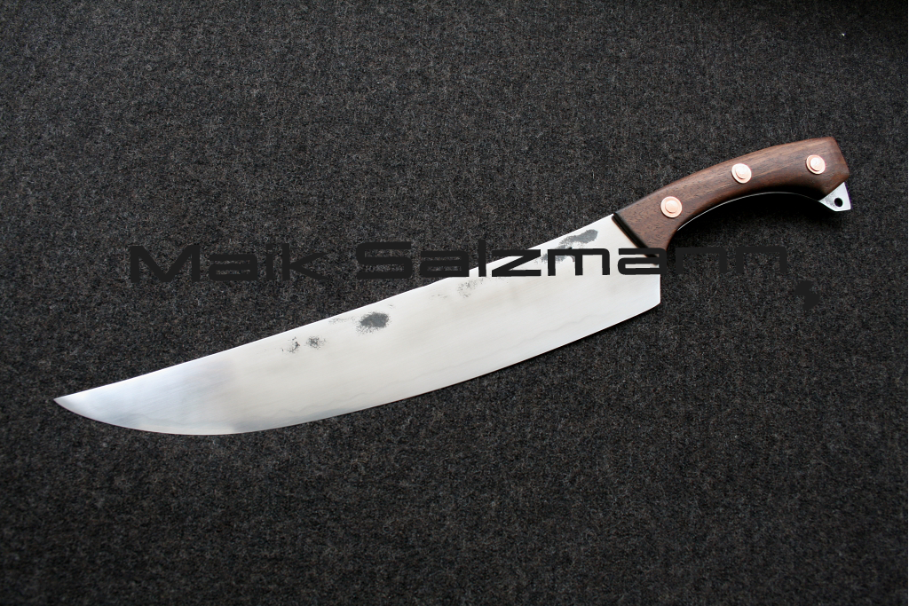Für den Hanon habe ich C 105 im Lehmmantel gehärtet (auf dem unteren Bild besser zu erkennen). Griff aus amerikanischem Nußbaum mit Kupfernieten. Gesamtlänge 370 mm, max Klingenhöhe 44 mm, Grifflänge 125 mm. Gewicht 290 g, Der Schwerpunkt ist in etwa bei meiner Schmiedemarke.